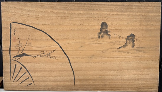 山口の古書店の方が持ち込んだそれは、表に二見浦と扇に書かれた梅の図と菊舎の落款、裏に各務支考の二見の句が書かれ、紛失した田耕一字庵の文台の特徴そのままの木の板でした。