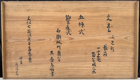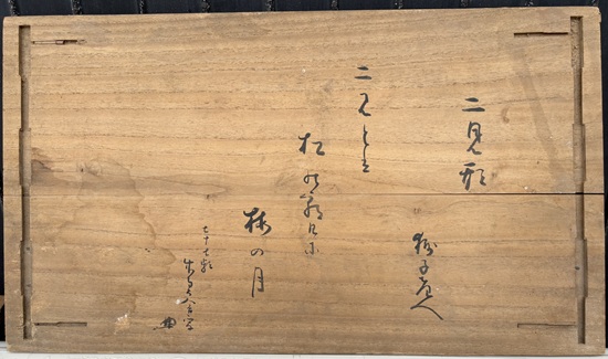付属の箱の蓋と思われる板に書かれた内容から、表は菊舎の画、裏は萩の竹奥舎其音の書で、どうやら田耕一字庵の文台の可能性は低く、